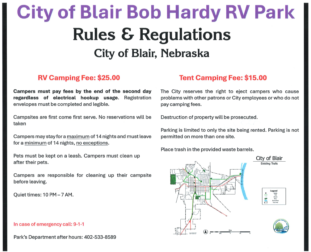 CITY OF BLAIR DOES NOT TAKE RESERVATIONS FOR THIS PARK.  IT IS A FIRST COME, FIRST SERVE BASIS.  Payment is made on a honor system and payment envelopes are located at the shower facility.