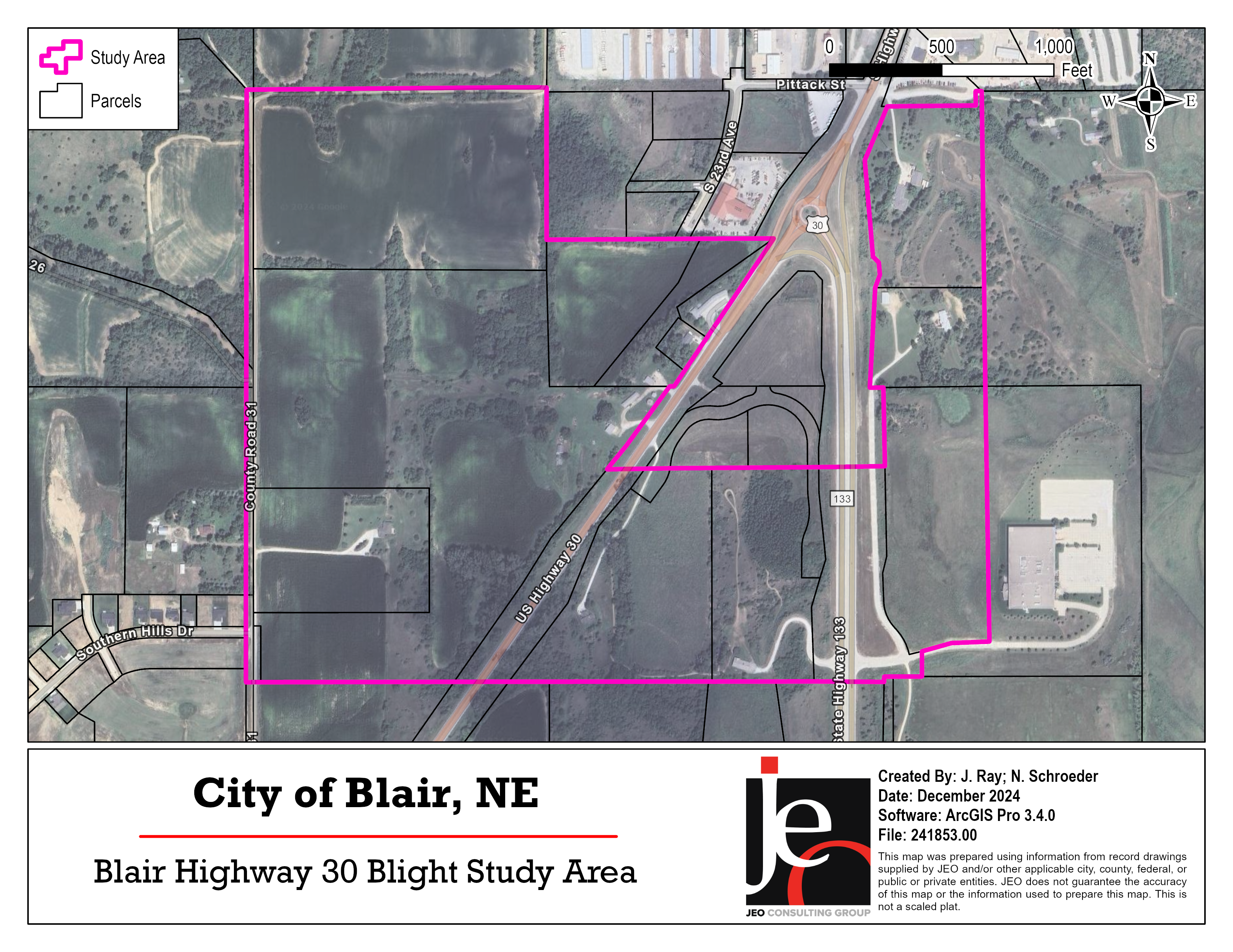 The approximate location of the proposed blighted and substandard area is south of the intersection of Pittack St and US Hwy 30.